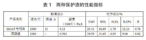 從上表可看出,高碳渣保護渣黏度、熔化溫度比GCr15鋼專用渣高,堿度比GCr15鋼專用渣低。